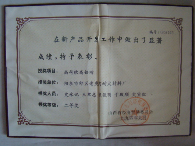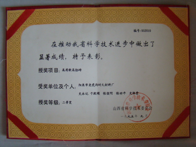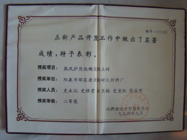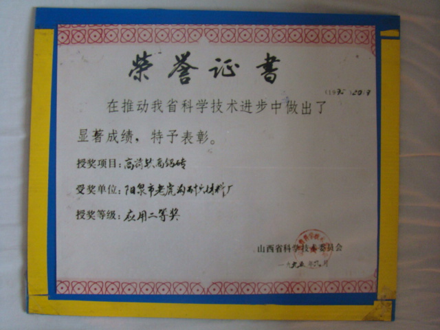 熱風(fēng)爐用低蠕變高鋁磚、高荷軟高鋁磚獲省科技進步二等獎,微膨脹高鋁磚列入火炬計劃項目,炭素焙燒爐用特種高鋁磚已批準(zhǔn)國家專利